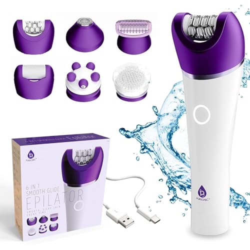 Pursonic 6-in-1 Smooth Glide Epilator for Women, Wet & Dry Electric Hair Removal Device with LED Light, Callus Remover, Exfoliating Brush, Shaver Head, Massage Attachment, Rechargeable Battery