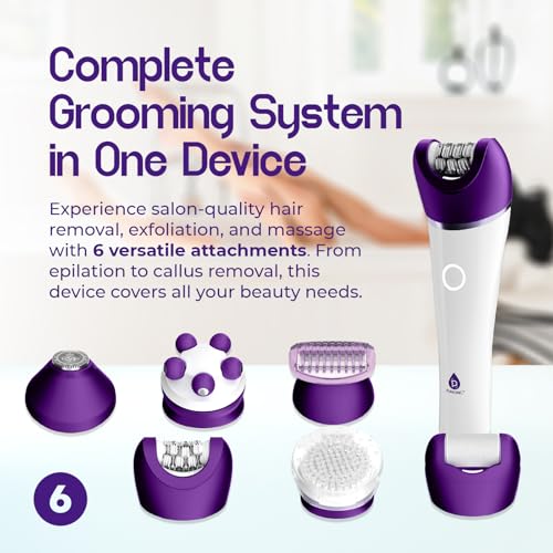 • All-In-One Epilating System: Enjoy salon-quality hair removal with 6 versatile attachments including an epilating head, shaver, massage head, exfoliating brush, callus remover, and more.