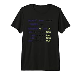Funny SQL Enthusiasts Programmers Select From GIRLS Query shirt Funny SQL Enthusiasts Programmers Select From GIRLS Query funny design for men, women, girl, young, dad, father, mother, uncle, son, daughter who like make gift for program about selection girl from 18 to 26. Funny gift about girlfriend, boyfriend Crafted from a unique 40 singles tri-blend fabric, offering a lightweight, ultra-soft feel Classic crew neck design with side-seam construction ensures both comfort and a flattering silhouette Lighter colors are semi-sheer