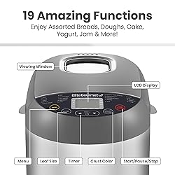 - The Elite Gourmet 2 lb digital bread machine takes the guess work out of making preservative free homemade bread. Ideal for busy chefs with 19 pre-set functions for all types of bread and flours to include: basic, quick (no yeast), sweet, french, whole wheat, rye, gluten-free, rice and sandwich breads, you can also prepare various doughs to include pizza, whole meal and leaven. Enjoy delicious breads, cakes and dough, preparing a variety of delicious breads is simple: just add ingredients, select your cycle, and press start. Once you’ve enjoyed your first delicious homemade batch, you’ll be experimenting with other tasty recipes and it won’t be long before family and friends are asking for more. Other homemade goodies include making jam, yogurt, and baking cakes. The delay function bakes overnight so warm bread is ready in the morning! Select your desired crust color from light, medium dark settings. Add your favorite nuts, seeds, or dried fruits for a unique touch! Mixes and prepares dough for pizza, focaccia bread, or cinnamon rolls. Comes with instruction manual, tips, and recipes. This is a true multi-functional appliance that saves time and money!