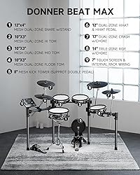 - Donner Beat Max Electronic Drum Set, Electric Drum Kit with 12" Quiet Mesh Drum Pads, 14" Cymbals w/Choke, 100 Kits and 1100+ Sounds, Sticks, USB MIDI, DONNER PLAY app (5 Pads, 4Cymbals)