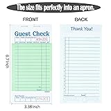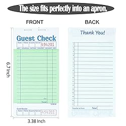 - Guest Checks Server Note Pads 12 Pack 600 Orders, Green Guest Check Pads with Bottom Receipt, Waitress Notepad for Restaurant Business Being a server and needing to keep everything in order in any busy restaurant or hospitality professional is super easy, just order pads can achive that! 【Package Includes】Each server pad 50 sheets, 10 books total 500 sheets, checkbook size 6.7 x 3.5 inch. Fits perfectly with apron pockets and server book. Note pads come packed in plastic. 【Medium Thickness】Our guest checks for servers are made of medium thickness paper, so that we can design perforated tearable dotted line to ensure even tearing. Too thick maybe have a problem. And you don't have to worry about ink bleeding and smearing when you write on both sides. 【Professional Design】Server pads are designed with perforated tearable dotted line and bottom receipt, easy to separate receipts for guests, save time. 【Numbered Checks】Each ticket has a unique serial number at the top to reduce errors. And the black area is easy to record important information such as date, order details, number of guests, order amount, table number, etc. 【Versatile】Indispensable accessory for servers to organize tasks, create grocery shopping lists and to-do lists and take orders. Perfect for restaurants, food trucks, lounges, hotels, cafes and small businesses. 【Safety Warning】Keep away from fire. 【Contact Us】If you experience a problem, please feel free to contact us, we'll appreciate it to learn from your experience, and we'll make it better.