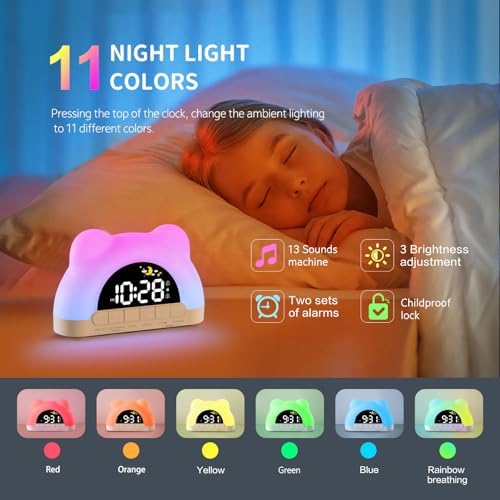 - 【Colorful Night Light】Pressing the top of the kids alarm clock can change the ambient lighting to 11 different colors. Night light and time display both have multiple brightness options.
