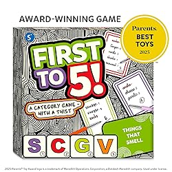 CATEGORY GAME WITH A TWIST!: Skillmatics First to 5! is a fast-paced game that challenges your creativity and quick thinking. Players race to write 5 words that match the category and letter cards—or shake things up by using the wild letter card! The goal is to finish first and outsmart your opponents. INCLUDES: 200 Category Cards, 30 Letter Cards, 8 Pens, 1 Notepad, and an Instruction Manual. HOW TO PLAY: Flip over 4 letter cards, a wild card, and a category card. Players must quickly write 5 unique words that fit the category. Each word can start with any of the letter cards (repeats are allowed), or you can use the wild card to make all your words start with the same letter—except the revealed letters. The first player to finish yells "STOP!" and everyone stops writing. Players then compare words—only unique words score points, and points are based on their starting letters. The player with the most points wins! AWARD WINNING FAMILY FUN: Winner of the 2025 Parents Best Toys Award, perfect for 2 to 8 players, ages 8 and up, bringing creative laughs to family nights, parties and get togethers! WILD CARD!: Use the Wild Card to score a heaping 15 points in just one round - but remember, all your words must start with the SAME letter! FAST & THRILLING: With easy-to-learn rules and quick rounds, this high-energy game keeps everyone engaged, delivering fast-paced fun and friendly competition! BOOSTS SKILLS: Strengthens creative thinking, quick decision-making, and vocabulary skills—all while having a blast! BEST GIFT FOR AGES 8+: A perfect gift for birthdays, holidays, and special occasions, bringing joy and excitement to any celebration!
