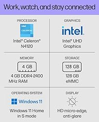 【Processor】Intel Celeron N4120 (up to 2.6 GHz burst frequency, 4 MB L2 cache, 4 cores, 4 threads) Ultra-low-voltage platform provides maximum high-efficiency power to go 【14" HD display】HP 14" Laptop with HD, micro-edge, BrightView display 【RAM & Storage】This computer comes with 4GB RAM & 128GB Storage 【Operating System】Windows 11 in S mode, 64-bit. You May Switch Windows 11 Home S Mode to the Regular Windows 11 Home 【Tech Specs】1 x USB 3.1 Type-C ports, 2 x USB 3.1 Type-A ports, 1 x HDMI, 1 x Headphone/Microphone Combo Jack. HP Fast Charge: Go from 0 to 50% charge in approximately 45 minutes, and 11.5 H battery life for you to work or study anywhere 【1 Year Office 365】Take your productivity and work mobility to the next level with the Microsoft 365 Office Suite (1 year subscription included)