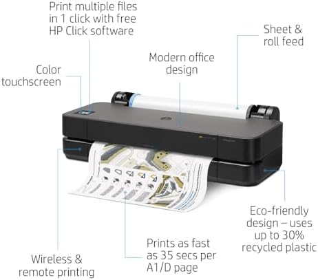 IDEAL FOR: Technical line-drawings, renders requiring precise, accurate line-quality and crisp text, posters, and detailed map prints. This printer is popular among architects, engineers, geographic firms, and construction professionals. CREATE PROFESSIONAL POSTERS: Design beautiful, professional quality posters for free. No graphic design experience required to produce beautiful high resolution posters in minutes. Choose from professionally designed templates or millions of free and premium photos, vector graphics or pattern designs. Connect your digital and physical worlds with a variety of rich, interactive digital experiences with HP LinkReader. Create and print directly to your HP Large Format printer with HP Click software (included) or integrate into your RIP software workflow. DESIGNED AROUND YOU: Avoid waiting by the printer with high-speed printing as fast as 35 seconds per A1/D plot. Be more productive—save time from job prep to final print by printing your projects up to 2x faster. Print your jobs and manage your plotter from virtually anywhere, anytime with the HP Smart app. Get high-quality results—HP Bright Office Inks plot up to 31% more line accuracy and up to 65% more gamut. Print with confidence, you'll get the results you expect with an intuitive driver and true print preview. FITS YOUR OFFICE & BUDGET: Save space with the world's smallest plotters designed to fit your office. Uses up to 95% less ink for routine maintenance vs. some competitor plotter printers. MEDIA SIZES: Up to 24-inch wide media rolls (large format), and up to 13-inch by 19-inch sheets (wide format) using the included automatic sheet feeder accessory. MEDIA HANDLING: Sheet feed, roll feed, automatic sheet/roll switch, automatic horizontal cutter. CONNECTIVITY: Gigabit Ethernet (1000Base-T), Hi-Speed USB 2.0, Wi-Fi Direct, Wi-Fi 802.11 b/g/n. PRINT SPEED & RAM: Up to 45 seconds per page on A1/D size, 59 A1/D size prints per hour. 500 MB onboard memory. SOFTWARE: HP Click (easy-to-use job submittal & poster creation tools), HP Smart app (print and share files from anywhere including smartphones, tablets, and desktop computers), HP Print Preview for Windows, HP Easy Start, HP DesignJet Utility for Windows, HP Support Assistant. ECO FRIENDLY: Features a more sustainable design which reduces CO2 emissions up to 7.3 tons/year by using up to 30% recycled plastic during the manufacturing process. WHAT'S IN THE BOX: HP DesignJet T230 24-inch printer, printhead, introductory ink cartridges, spindle, quick reference guide, setup poster, power cord. 2-YEAR WARRANTY CARE PACK: Comprehensive large format device protection with enhanced coverage including remote technical support, onsite support, and HP parts. As fast as next business day device service if your issue can’t be resolved via remote support or online virtual assistant. Plotter printer repairs performed by HP technicians using 100% genuine HP parts. HP Virtual Assistant is available 7 days a week. HP Remote and Onsite Support is available Mon-Fri. No hidden fees. See product documentation (.pdf file available on product page) for more details.
