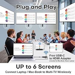 【Portable Multi-Screen Streaming】Wireless HDMI G7R PRO Portable—delivers 165FT/50M long-range transmission for stable performance across various scenarios. Portable easy to carry, ideal for on-the-go mobile users or events, and fits effortlessly into any setup. Wirelessly stream business presentations, videos, and favorite movies to be multi-displayed anytime, anywhere. Suitable for both personal and professional setups. Recommended Up to 6 Screens: 4-RXs (Multiple TVs) + 2 Mobiles(Phone/Pad). Buy Extra RX at Asin: B0DPDBYNCQ. 【Next-Gen 5G Chip, Heat-Control Technology】Equipped with an updated 5G chip and heat-control technology for Automatic Cooling, Wireless HDMI to Multiple TVs ensures stable connectivity and prevents overheating even during extended use. Enjoy uninterrupted streaming even in crowded environments, making it perfect for meetings, classrooms, churches, conference rooms, restaurants, and family gatherings. 【Plug and Play, 5.8G/2.4G Unfold Antennas】Pre-paired HDMI Transmitter and Receiver sets ensure easy setup. Operate on the 2.4G/5.8GHz Dual-Band frequency- No apps, drivers, or Wi-Fi needed. Simply connect and start streaming- will automatically sync within seconds. Wireless HDMI transmitter and receiver Unfold Antennas enhance signal strength stronger and stability. 【@60Hz High Screen Refresh Rate- Only 0.1s Latency】 Enjoy real-time, lag-free video and audio streaming @60Hz with an ultra-low 0.1s latency. Powerful 5G chip provides stable, real-time, lag-free high-quality visuals, effortlessly to various scenarios, whether gaming, live sports,s on multiple large screens. HDMI Sender and Receiver Wireless connectors deliver stable performance across various scenarios. 【Long-Transmission Range with Multiple TVs】Enjoy reliable, high-quality streaming with a 165FT/50M transmission range in open environments (with no barriers) and advanced 5G technology that maintains connectivity up to 50FT/15M through walls (avoid thick walls or large obstacles). Wireless HDMI Splitter High-quality streaming for business presentations, educational, home theaters, and entertainment. 【Free USB-C to HDMI Adapter (Connect with TX Transmitter)】Includes a free USB-C to HDMI adapter, perfect for new laptop models such as MacBooks and other USB-C devices. This wireless video transmitter and receiver feature simplifies setup for users with the latest technology, making it a versatile solution for modern workspaces. Perfect for hassle-free wirelessly stream to multiple TVs on the latest laptops. 【USB 5V1A Power Source】Wireless HDMI Extender TX and RX, both powered by a USB 5V1A source. P.S.: When powering the TX via your laptop's USB port, please keep your laptop connected to a power source to ensure stable performance. Compatible with various HDMI Output devices like laptops, PCs, cameras, and gaming consoles. 【TUTUPlay App for Wireless Mobile Mirroring】Mirror your laptop or PC to your smartphone or tablet with the TUTUPlay App (compatible with iOS and Android). Perfect for on-the-go professionals, this app transforms your mobile devices into secondary displays for enhanced productivity. Wirelessly Mirror Laptop-to-Phone/Pad/iPhone/iPad.