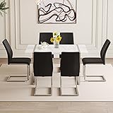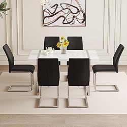 White Dining Table Set for 6:Modern dining table set for 6 with classic color scheme of black and white the design is simple and elegant. Its smooth lines and simple shape are suitable for modern style kitchen,and integrated into a variety of living room decoration 7-Piece Dining Table Set:The size of this kitchen dining table set is 55.12*31.5*29.8 inches, this dining table set is perfect for small apartments or other limited Spaces. Paired with 6 high back dining chairs, each measuring 18.9 inches,saves space and adds a modern feel Kitchen Table with Chairs Set of 6:The surface of this table is smooth and easy to clean. The metal silver mirror table leg design is not only durable, but also adds a modern gloss. It's built to hold up to 300 pounds Kitchen Dining Table Set for 6:This chair has ergonomic back design. The selection of high-quality faux leather,feels delicate, easy to clean and maintain a long-term clean appearance Dining Room Set Service: This juego de comedor 6 sillas y mesa, with a simple design and complete installation accessories, is expected to take approximately 20-30 minutes to install