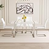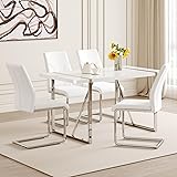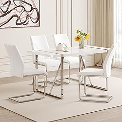 White Dining Table Set for 4:Modern dining table set for 4 with classic color scheme of white the design is simple and elegant. Its smooth lines and simple shape are suitable for modern style kitchen,and integrated into a variety of living room decoration 5-Piece Dining Table Set:The size of this kitchen dining table set is 55.12*31.5*29.8 inches, this dining table set is perfect for small apartments or other limited Spaces. Paired with 4 high back dining chairs, each measuring 18.6 inches,saves space and adds a modern feel Kitchen Table with Chairs Set of 4:The surface of this table is smooth and easy to clean. The metal silver mirror table leg design is not only durable, but also adds a modern gloss. It's built to hold up to 300 pounds Kitchen Dining Table Set for 4:This chair has ergonomic back design. The selection of high-quality faux leather,feels delicate, easy to clean and maintain a long-term clean appearance Dining Room Set Service: This juego de comedor 4 sillas y mesa, with a simple design and complete installation accessories, is expected to take approximately 20-30 minutes to install