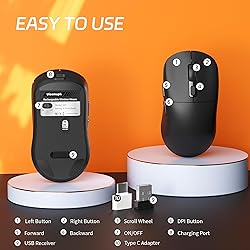 USB A and USB C Connection: This wireless mouse is packed with USB receiver (stored at the mouse bottom) and USB C adapter, works for computer with USB A or USB C port. For USB C connection, simply plug the USB receiver into the adapter, then plug adapter into your device. USB C Rechargeable: This wireless mouse is with built-in rechargeable battery, simply charge the mouse with Type C charging cable (included), no need to change batteries. Ergonomic Design: Designed with your comfort in mind, the ergonomic shape and smooth touching of this mouse ensures a comfortable grip for long time use. 3 Adjustable DPI: 3 Adjustable DPI levels (1000-1200-1600) enables you to change the speed and sensitivity of the mouse cursor. Side Buttons: The side button makes you flexible to go back or forward when you are use it and is more convenient for working. Widely Compatibility: This rechargeable mouse works for Windows 7/8/10/XP, Vista, Linux, Mac OS, Chrome OS etc. It's compatible with most of the computers with USB C port, like MacBook Pro after 2016, MacBook Air after 2018, Chromebook and more.