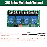 30A 4-Channel Relay Module: Load Voltage: DC 30V / AC 250V 30A ; Module Power Supply : DC 12V(Module Supply Voltage Must Be DC, and the Voltage to be Consistent with the Relay Voltage.); Trigger Current : 5mA High Quality: 30A 4-Channel Relay Module Can Withstand High Power, and its Maximum Load Control Can Be Up to 30A, Able to Control Various Industrial Control Scenarios Such as PLC Automation Equipment Control and Industrial System Control Optocoupler Isolation Design: 30A Relay Control Module Use of Patch Optocoupler Isolation Design and Each Channel of the Circuit Control Module is Equipped with a Relay LED Indicator to Show the Switch Status of the Channels, Clearly Display the Working Status of the Module Convenient to Operation: 30A 1-Channel Relay Module Designed for User-friendly Operation, with Jumper Settings for High or Low-Level Triggering, Ensuring Simplicity in Setup. All Interfaces Can be Wired through Terminal Blocks Directly, Facilitating Quick Assembly and Debugging Applications: 30A 1-Channel Relay Module Suitable for PLC Automation Equipment Control, Industrial System Control,IOT Control,Electronic Enthusiasts to Develop Experiments, Meeting the Control Needs of Different Fields. An Ideal Choice for Both Professional Users and Electronic Enthusiasts