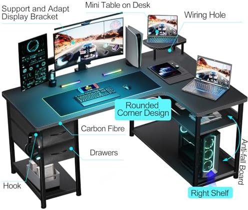 • [Luxurious Carbon Fiber & Why Choose Us?]: The upgraded L-shaped gaming desk offers extra space and storage with 2 drawers, rounded corners, a carbon fiber look, a small monitor stand, wire organizer grommet, and a panel to prevent items from falling. It’s also compatible with monitor arms. A perfect blend of style and functionality, this corner desk has been a top-seller in Japan.