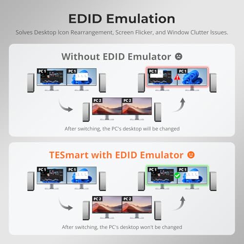 - EDID Emulation: Built-in EDID emulators prevent resolution changes or icon rearrangements during switching, ensuring smooth transitions between PCs and preserving your workflow’s integrity