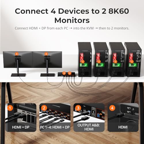 - KVM Switch 4 Computers: The 1x HDMI 2.1 and 1x DP 1.4 ports per PC ensure better GPU compatibility. Effortlessly manage 4 PCs with a single keyboard, mouse, and dual 4K@144Hz displays