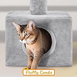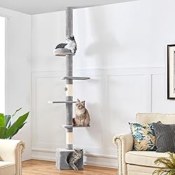 Freely Adjustable Height: Equipped with an adjustable mechanism, this five-level tall cat tower stretches from the floor to a 7.4-8.7 ft. high ceiling. The matching cover hides the adjustable mechanism, giving the tower a more sophisticated appearance Multi-Levels for Hours of Fun: This five-layered cat tree tower features four perches that can be positioned in various directions for customizable climbs. The top perch has foam edges for comfort, and the spacious bottom condo is a cozy hideaway Space-efficient Cat Furniture: This slim and sleek cat tree comes in handy if you're tight on space. With a small footprint, it provides ample perching, scratching, and climbing space for your furry friends. Ideal for small apartments and limited spaces Pet-friendly & Sturdy: Made of 1/2″ thick CARB P2-compliant particleboards and soft plush, this floor-to-ceiling cat tree provides excellent stability and safety for your active companions, with a wall anchor for added protection Removable & Portable: The top post of this height-adjustable cat tree snugly fits against the ceiling by a tension rod, allowing you to easily relocate it whenever you want without any hassle