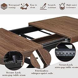 【Extendable Rectangle Dining Table Set】- Upgrade your space with MECHYIN versatile farmhouse dining table featuring a smooth silent rail system for effortless transformation. In its compact form 55.11” L x 31.49” W , this dining table seats 4-6-8 and doubles as a space-saving solution. Insert the included extension leaf to extend the length to 70.86”, creating a spacious kitchen table comfortably seating 6-8—ideal for gatherings. The innovative drop-leaf-inspired design makes it a functional transformer table for dynamic lifestyles. Please note that:Width:31.5 inch 【Durable & Sturdy Construction】- Crafted with premium MDF and a scratch-resistant, waterproof finish, MECHYIN engineered wooden MDF dining table combines farmhouse charm with modern resilience. Reinforced by black cross-metal legs and adjustable feet, the rectangle dining room table ensures wobble-free stability, and can support up to 500 lbs. Perfect as a daily-use dinner table or an expandable table for hosting, it balances minimalist aesthetics with industrial-grade durability. Please note that:Width:31.5 inch. 【Multipurpose Design for Every Occasion】- Blending particleboard rustic wood-grain textures with clean lines, this kitchen & dining room table set adapts to any decor—from cozy kitchens to home offices. Use it as a casual breakfast table, a chic conference table, or a festive picnic surface. The modern rectangle dining table’s neutral style and practical size make it a timeless addition to multifunctional living spaces.Also: Color may vary slightly under different lighting conditions and display settings. 【Smart Storage & Easy Expansion】- Maximize convenience with MECHYIN space saving dining table’s hidden storage compartment under the tabletop—perfect for stashing small items, such as tableware, tablecloths or even board games. The collapsible drop-leaf mechanism tucks neatly away when not in use, maintaining sleek proportions. No clutter, no hassle—just quick transitions between intimate dinners and large celebrations. Please note that:Width:31.5 inch 【Stress-Free Assembly & Support】- Every extendable table includes labeled parts, tools, and step-by-step instructions for seamless setup. Backed by responsive customer service, we guarantee prompt solutions for any missing components or assembly queries. Elevate your home with this durable, stylish expandable kitchen table set—where functionality meets farmhouse elegance.