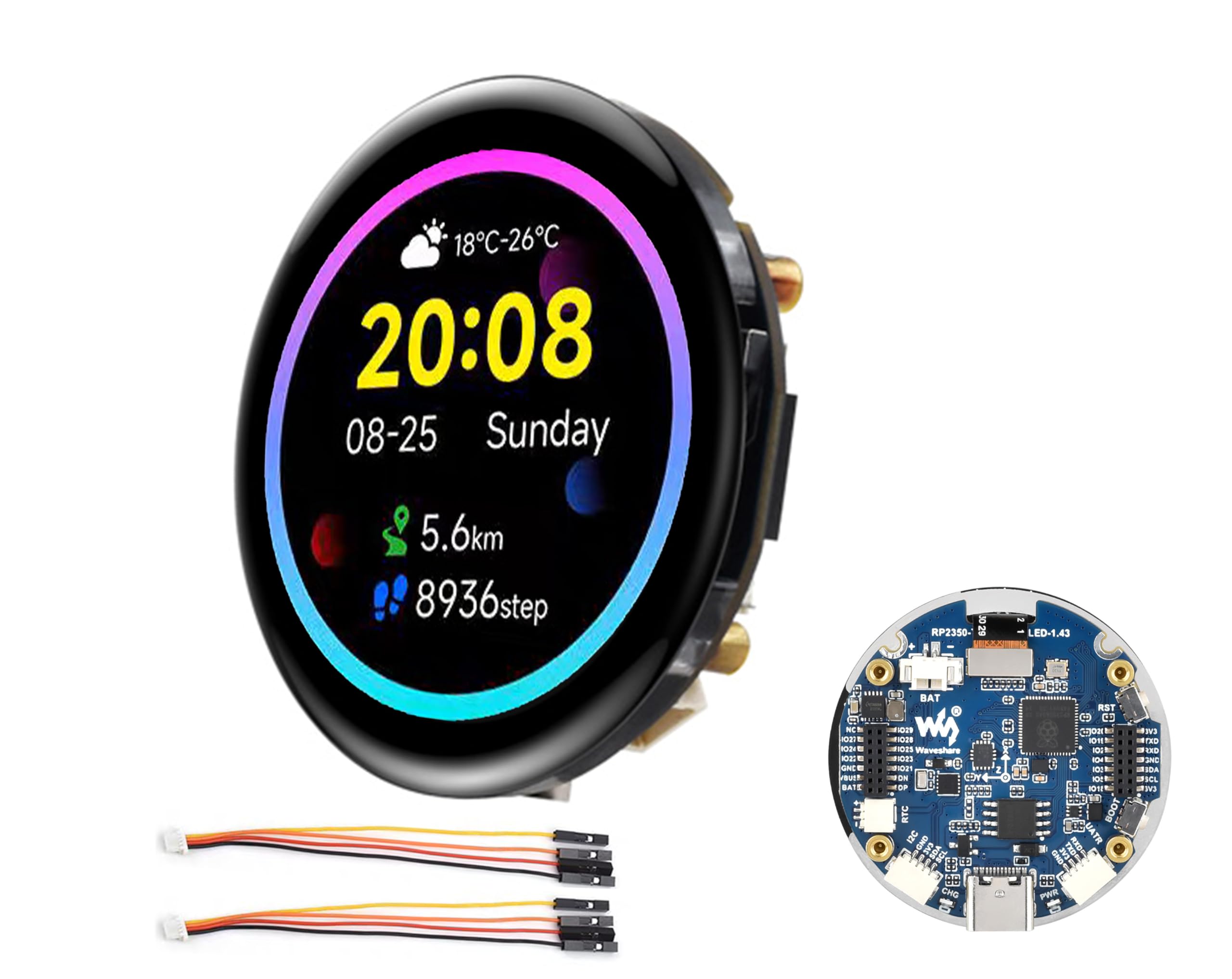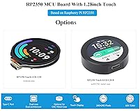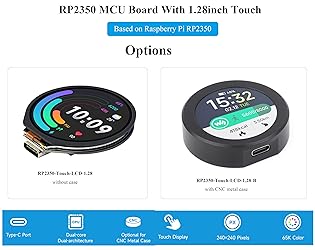 - RP2350 MCU Board, With 1.28inch Round Touch LCD, Dual-core & Dual-architecture Design, 240×240 Pixels, 65K Color, IPS Panel. Features RP2350 microcontroller chip is Original from United Kingdom. Adopts unique dual-core and dual-architecture design: dual-core Arm Cortex-M33 processor and dual-core Hazard3 RISC-V processor, flexible clock running up to 150 MHz 520KB of SRAM, and 16MB of onboard Flash memory Type-C connector, keeps it up to date, easier to use Onboard 1.28inch capacitive touch LCD, 240×240 pixels, supports 65K color for clear color picture display Li ba--tte-ry recharge/discharge header, suitable for mobile devices USB 1.1 with device and host support Low-power sleep and dormant modes Drag-and-drop programming using mass storage over USB Accurate clock and timer on-chip Temperature sensor 6 × GPIO pin via SH1.0 connector Package Content RP2350-Touch-LCD-1.28 x1 SH1.0 12PIN cable x1