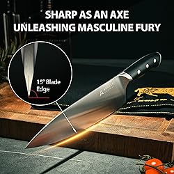 【Freshly Sharp】Knife Set with Block blade is forged from high-carbon German stainless steel, with a hardness of up to 58±2Hrc for lasting sharpness. Handcrafted with a 15° cutting angle for optimal slicing, cutting through food is as effortless as cutting through butter. 【Timeless Legacy】Kitchen Knife Set requires 45 days of meticulous craftsmanship from the bladesmith, with each knife being forged and merged thousands of times. It is the unique Hasebe edge grinding technique that casts a perfect rust-resistant chef's knife. 【Easy Control】Knife Block Set handle features a one-piece steel triple-riveted secure structure, ergonomically designed for a comfortable grip that provides anti-slip and anti-fall functionality. The golden ratio balance point makes cutting food more effortless. 【All-Around Helper】Knife Set includes all the most common kitchen knives, such as a 9-inch chef's knife, an 8-inch bread knife, a 7-inch santoku knife, a 5-inch utility knife, a 3.5-inch paring knife, 4.5-inch steak knives x6, kitchen shears, an integrated sharpener, and a walnut knife block with non-slip feet. 【Lifetime Care】Chef Knife Set Arrtcy knife set with a block ensures you can use our products risk-free, offering a lifetime warranty. If you are not satisfied, We will replace the product for free and provide 24/7 online support.