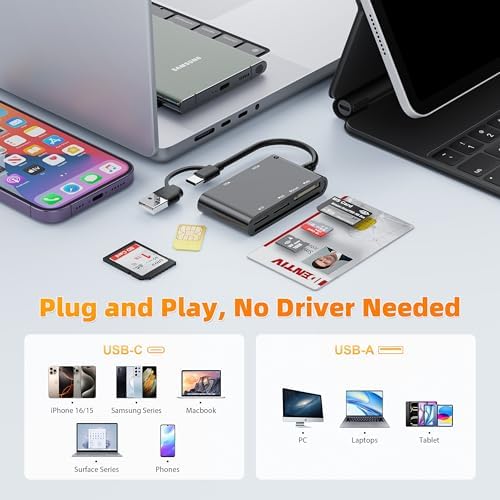 - 【2-IN-1 Connector Design】SD card reader adapter has multiple interfaces, comes with USB/Type C connectors, Type-C connector for iPhone 16 16Pro, 15 15Pro 15Plus, Samsung Galaxy S24 S23 S22 S20 S10 S9 S8 Note 9 8, LG G5 G6 V20, Chromebook, Google Pixel, Google Nexus 5X 6P, Huawei. USB connector compatible with Mac OS, Windows XP/Vista/7/8/8.1/10 and etc. Such as MacBook Pro, MacBook Air, Surface Pro, Dell, HP and other PC.