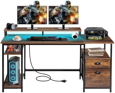 Panana 61.4" Computer Desk with Power Outlet and LED Lights, Desk with 2 Fabric File Cabinet Drawer, Large Reversible Gaming Desk with Shelves and Monitor Stand, Writing Study Desk for Home Office