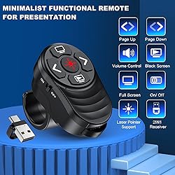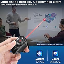 【2 in 1 USB Type C Receiver & Magnetic Storage Design & NO APP】Plug & Play,2.4GHz.Our wireless presentation clicker is equipped with 2 in 1 USB Type C receiver compatibility with MAC,Laptops,PC,Computer.A multifunctional PPT click gadget for users using newer devices. Needn't to purchase a new slide clicker if you changed your device. The 2.4GHz dongle is magnetically stored at the bottom of the power point clicker,our wireless presenter remote is ideal for professional and educational settings 【Minimalist Functional Remote for Presentations】The PPT clicker combines the features of volume control,page forward/backward, switch windows,full/black screen.Suitable for wireless remote presentations in classrooms, churches, auditoriums, conference rooms, speeches and more.The presentation supports systems: Windows 2003/XP/Vista/7/8/10, Mac OS, Android,Linux;supports software: PPT, iWork (Keynote & Numbers & Pages), Prezi, MS Word, Excel, ACDSee, Website, etc. 【Rechargeable Presenter Clicker Wireless & Low Battery Reminder】Rechargeable feature of this PPT remote clicker allowing it to be recharged with the provided USB C cable anytime,full charge takes 1.5 hours, can be used for 7 days, standby for 30 days,eliminating the need for disposable batteries and ensuring that the laptop clicker is always in use.Our presentation remote clicker with a low power indicator reminds you charge it in time.The blue light flashes once every second, indicating that the battery level is low and needs to be charged in a timely manner 【Bright Red Light & 98Range & 328FT Range】The clicker for presentations with a bright light is easy to highlight your points and draw audience's attenion (Not recommended for LED, LCD screens); Long range of the slideshow clicker which allows you walk around even in large rooms and not be stuck at computer.Our presentation controller control range: 98FT, Red light range: 328FT.it's a suitable slideshow tool for teachers, professors, priests 【Finger Ring Design & Compact Size】Our PPT clicker ring is made of rubber material, which is hard enough to grip your fingers and can be opened as needed to bend enough to fit most fingers without applying excessive pressure to them. You don't have to worry about falling off during the presentation, it allows you to actually hold things with your hands, write on the whiteboard, or flip charts. If you travel a lot, the compact size is suitable for carrying around and is a small tool for a on the go office 【Package List】1x Rechargeable Slideshow Clicker with Light Pointer,1x 2 in 1 USB Type C Receiver,1x USB C Charging Cable