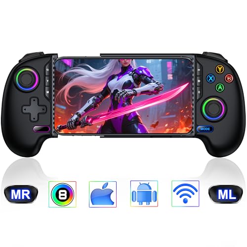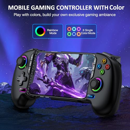 - 【8 Adjustable Cool RGB Lighting Effects】Our iphone controller for gaming equipped with RGB dazzling atmosphere lighting effect, press the light button to adjust the brightness of the lights (a total of 10 levels of brightness, each press of the light button will increase by one level, cycle adjustment). Press the RGB key to cycle and adjust the light effect mode: flash color → gradient color → slow flash color → monochrome gradient → pink constant light → cyan constant light → green constant light → blue constant light → purple constant light → orange constant light.while showcasing your gaming skills,enhance the rich and colorful gaming atmosphere