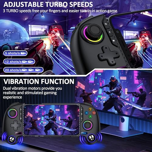- 【Upgraded 360°Hall Joystick & 3 Speeds Adjustable TURBO Function】Our wireless controller for iphone is equipped with upgraded hall effect joystick that no drift, no wear out, no dead zones. Separate zero dead zone switch button, one click switch joystick zero dead zone, making game operation response more timely and efficient.During the game,more responsive, any small movements will be accurately reflected, greatly improving the gaming experience for loyal players. The Turbo function supports manual and automatic continuous firing, with three adjustable speeds: 5/12/20 per second, making it easier for you to defeat opponents in the game