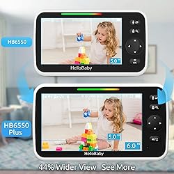 World's 1st 6" IPS Screen Brand: See Every Detail, Day or Night. Reduce eye strain with our large, portable 6-inch display – crystal clear from any angle. Effortlessly check on your sleeping baby or elderly loved one at 3 AM without harsh light. HelloBaby HB6550Plus Outshines even the #1 HB6550 for viewing comfort. Ideal large screen baby monitor for elderly and bleary-eyed new parents! First Brand with Unbeatable 16-30 Hr Long Battery Baby Monitor: Sleep Soundly, Monitor Worry-Free. Get through multiple nights on a single charge! Never scramble for an outlet mid-sleep. Portable baby monitor perfect for travel. Wake up refreshed, knowing you're covered. Remote 355° Pan and Tilt Baby Monitor & Wide Angle Lens: Fully remote Pan & Tilt achieved a seamless 360-degree viewing, with the hello baby camera panning 355 degrees side to side and tilting 120 degrees up and down. Plus, the wide-angle lens enhances coverage, letting you capture every detail without a blind spot. Stay in control and never miss a precious moment with the ability to adjust the screen for the complete view of your baby's room, every time! Easy Set up & Stable Connection & Baby Monitor No WiFi Needed: This is a non-wifi baby monitor with video and audio, designed for ease of use and ultimate peace of mind. Utilizing cutting-edge 2.4GHz FHSS and digital encryption technology, you can rest assured that your baby's safety is our top priority. No WiFi, No APP downloading, No hacking risks, just a quick, secure connection between the camera and monitor. Believe me, your baby is safe and you could focus on what matters most without any worries. Infrared Night Vision & 2-Way Audio Video Baby Monitor: Crisp night vision gives you a clear view of your little one as they snooze. We are the first brand to adopt the invisible infrared LED baby monitor, you can have a clear video feed at night without disrupting your little baby. The crystal clear Two-Way Audio feature allows conversation both ends as clear as if you were in the same room with your little one. Considerate Baby Monitor Features: Room Temperature Monitor and Alert, Night vision, 8 Lullabies, Sound Level LED Indicator, Audio only Saving Power Mode, Tabletop or Wall Mounting Options, Remote Pan-Tilt-Zoom, Split Screen (up to 2 Camera Expandability), ideal gifts for baby register, new parent gift. Enlarged Screen of HelloBaby HB6550 Baby Monitor & Perfect Service: #1 Brand, Newest model, #1 Service, the Larger 6'' Screen - that’s HB6550Plus. Easy to use, clear video, adjustable lullabies, large split screen, night vision, 150 country languages, room temperature sensor, and feeding timer to give moms a reminder to feed their babies at night! Using our HD baby monitor makes the entire parenting process happier and convenient. 1 Year Guarantee! Trust in the professional service provided by the #1 sales team.