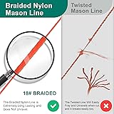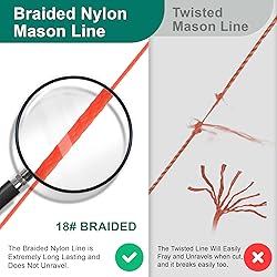[Wide Application]: Braided Mason Line #18 Nylon Mason Line is a heavy duty medium stretch line, this thick line is made of high quality nylon. It can be applied in a variety of outdoor and indoor applications including gardening, marking and DIY projects, fishing, boating, masonry, crafts, and more. The braided design allows this marking cord to hold up in the toughest conditions [High Strength and Durability]: Made of high strength virgin nylon yarn, the nylon string line is stronger than polypropylene twine. Braided mason line has excellent durability, holds up to trowel strikes, without knotting & kinking Down the stretch. The diameter spindle of our mason Line String is 0.06in(1.52mm) with an approximate tensile strength of 160LBS, and twisted nylon rope will unravel after being cut, braided mason string level won't unravel when been tied knots or cut [Precision Measurement]: Equipped with 10 built in levels to help professionals quickly and accurately ensure the levelness of every brick or block, providing precise support for construction projects. This string level line kit is an essential tool on construction sites [Easy to use]: Ideal for use with string line level or for any commercial twine heavy duty outdoor projects. Use as plumb line, or with surveyors plumb bob with string, or with a masonry line holder. Otherwise, our Mason line is designed with a handle, which makes it easy to hold and use, and you can also easily reload the spool at any time [Bright colors]: Each braided masonry line roll is fluorescent and easy to see. Perfect outdoor string for use as landscape twine, property line markers, construction twine, or marker string. This orange string is perfect for use in the garden. Use it as tomato twine string to tie up tomato plants, or for wick watering African violets, or general landscaping twine