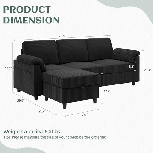 Vongrasig Convertible Sectional Couches, 3 Seat L Shaped Couch Sofa with Removable Pillows Soft Corduroy Fabric Small Couch Mid Century for Living Room, Apartment and Office Black