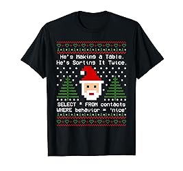 The Computer Scientist Motive Shows The Saying: He's Making A Table, He's Sorting It Twice, SELECT All FROM Contacts WHERE Behaviour = 'nice'; Santa Claus Works As A Database Administrator This Year And Uses SQL To Determine The Nice Kids. This Joke Or Pun Design Could Be A Christmas Present And Idea For A Computer Scientist, Developer, Programmer, Coder And For A Database Administrator. It Is Suitable For The Work In The It Industry And When Dealing With A DB And DBMS. Lightweight, Classic fit, Double-needle sleeve and bottom hem