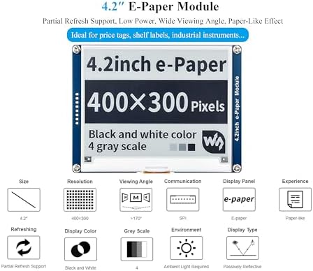 4.2inch e-Paper Module E-Ink Display Compatible with Raspberry Pi 5/4B/3B+/Zero/Zero W/Zero 2W/Pico/Pico W/Pico 2/Pico 2W, 400x300 Pixels, Black/White Color SPI Interface, Support Partial Refresh