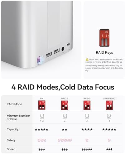 - RAID Mode: The 3.5-inch SATA hard drive enclosure can be configured in RAID 0, RAID 1, single-disk, or JBOD modes to meet diverse user requirements while ensuring robust data security. Note: The RAID mode controls on this unit operate in reverse order from bottom to top. Always verify settings before finalizing to ensure proper configuration and safeguard data integrity