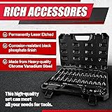 【Size Included】The 29pcs 1/2" socket sets include 3pcs extension bar: 3" ,5" 10". 11pcs sae socket sets: 3/8", 7/16", 1/2", 9/16", 5/8", 11/16", 3/4", 13/16", 7/8", 15/16", 1". 15pcs metric socket sets : 10-24mm. Totally 29pcs. 【Material】The impact socket sets are made of high-quality chrome vanadium steel with strong hardness. The heat treated CR-V steel has better toughness, and its surface is coated with a black powder coating of rust prevention and corrosion prevention,which is highly corrosion-resistant. 【Corrosion Resistance and Durability】The surface of the deep-drawn sleeve is coated with manganese phosphate, which can extend the service life of the socket, prevent the socket set from rusting, and greatly improve the corrosion resistance and durability of the socket. 【Advantages】 The dimensions on the socket are all high-contrast dimensions of laser printing, which are not easy to wear out and can be seen clearly in low light.It is convenient for you to work at night.The sockets are precisely dimensioned for use in all types of automotive or mechanical equipment.The 6-point design can effectively prevent the nut from wearing and slipping. 【Easy to Transport,Easy to Install】The deep metric sockets will be equipped with a heavy tool box for transportation, so you don't need to worry about the loss of spare parts on the road, which is easy to store and carry. 【Note】If you receive the sockets with protective oil, please be assured because it is a new set of sockets. This is a rust inhibiting oil used to protect the product. Please use it carefully. Due to shipping issues, the surface of the product may air-drying, so you can apply rust preventive oil to keep it shiny.