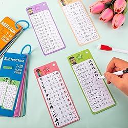 Learning Addition and Subtraction Tool: You will get 15 Addition flash cards (0-12) and 15 Subtraction flash cards, 4 black and red markers pen and 2 metal binder rings, help you enjoy in fun math games at home, classroom Durable Material: Our math flash cards are made of thickened cardboard, with a laminated design that is waterproof and won't fade. Besides, The card can be reused and practiced multiple times to deepen the impression due to the erasable handwriting of the marker pen Pocket Size: The size of the timetable flashcard is 5.9x3.54 inches/15x9 centimeters, and it is designed with rounded corners to avoid scratches, making it easy to put in the pocket. Binding rings can not only be stored and organized, but also hung on backpacks for easy carrying and learning at any time Double Printing: The addition and subtraction chart uses 2 sides printing , one side are printed addition and subtraction questions, one side with answers, It is equipped with a two-color pen to facilitate children to check and score the answers after answering the questions, convenient for self leaning, checking, and interactive learning Versatile Uses: Times table flash cards is really a good teaching supplies for teachers and parents to teach children to learn basic addition and subtraction and knowledge,cultivate children's basic arithmetic skills. These cards also can be share to neighbors and relatives, Increase communication for studying