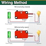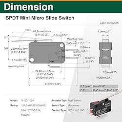 Product Information: Model Number: V-153-1C25. Rated for 15A, 1/2HP; 125/250V AC; 0.6A, 125V DC; and 0.3A, 250V DC. Operating temperature range: -25°C to 85°C. Contact type: SPDT 1NO 1NC contact. Actuator type: Long Straight Hinge Lever Compact and Durable: Measuring 1.1" x 0.39" x 0.63",Actuator size: 2" x 0.18", this microswitch features a rugged ABS housing and silver contacts for optimal conductivity. The dustproof design ensures long-lasting performance even in harsh environments Versatile Applications: Our limit switches with Long Straight Hinge Lever excels in Automated robotic arms and conveyor systems, providing precise control over mechanical components in applications such as Industrial machinery, elevators, lifting equipment Easy Installation and Efficient Operation: With a plug terminal or welding wiring option, installation is a breeze. The short operating stroke, low actuation force, and Roller Lever Arm actuator enable fast and precise switching Reliable Performance: Engineered with high-precision manufacturing, this micro push button switch boasts low power consumption and a long mechanical lifespan, delivering reliable performance in demanding applications