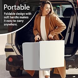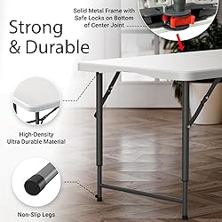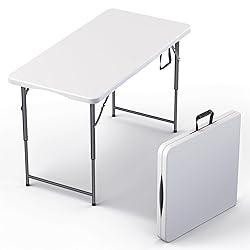 ✅【 Foldable Design 】The tabletop of this table folds in half allowing you to easily carry and transport between locations using the built in handles. Once folded, the table can easily be stored in closets, under beds, or in your car trunk to use for later. Take it anywhere you need – from your living room to a campsite. ✅【 Versatile 】This folding table is the perfect choice if you need a table temporarily. Ideal for events, parties, cookouts, or dining, this foldable table can be quickly set up indoors or outdoors. Put a table cloth over it, and it instantly transforms into a modern display table for any occasion. ✅【 Adjustable Height 】Adjust the height of this table seemlessly between 20.5" and 29" with 4 button presses. Raise or lower the height of the table to fit your desired application whether to use as a kid's table, display stand, or crafting station. ✅【 Heavy Duty Construction 】Made from heavy duty high density plastic, this table is durable enough to hold anything you place on its table top. Its metal frame is strong enough to support up to 300 lbs ensuring stability and long-lasting use. ✅【 Easy to Clean & No Tools Needed 】Its smooth surface makes cleaning a breeze. Easily wipe away any spills using a damp cloth. There are no tools required. Simply unfold and lock the legs into place in seconds.