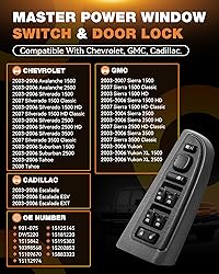 - This Front Driver Side Door Lock & Power Window Switch is the perfect replacement for faulty window switches in various Chevy, GMC, and Cadillac models. Whether you need to replace a broken switch or upgrade your existing one, this product offers an easy-to-install solution that matches the function and appearance of the original part. Key Features: Compatibility: Designed to fit 2003-2008 Chevy Avalanche, Silverado, Suburban, Tahoe, as well as GMC Yukon and Cadillac Escalade models. It is engineered to replace part numbers 15883323, DWS-220, 901-075, 10398568, and many more, providing a broad range of compatibility with various models and trims. Durability: The switch is made from high-quality ABS and polycarbonate materials, ensuring excellent performance and durability. It features a sturdy construction, making it resistant to wear and tear, and provides smooth operation for years to come. Easy Installation: Replacing the defective switch is hassle-free. Simply remove your old switch and connect the new one using the factory harness connections. No cutting or drilling required. It’s designed to install just like the original switch. Functionality: The black bezel cover adds a stylish, sleek look to your vehicle’s interior while also ensuring the switch is protected. The precise design and robust construction make it a long-lasting replacement that can handle everyday use with ease. Warranty & Support: This switch comes with a 1-year warranty. If you encounter any issues, our dedicated customer service team is here to assist you. Feel free to contact us via Amazon Message, and we will ensure a quick and efficient resolution.