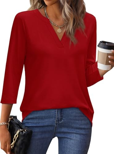 OFEEFAN 3/4 Length Sleeve Womens Tops V Neck Tunic Shirts Loose Curved Hem Blouses Dressy Casual S-3XL
