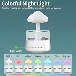 - Elevate your space with the Rain Cloud Mushroom-Shaped Air Humidifier, a stylish and functional addition to any room. This unique humidifier, resembling a gentle rain cloud, boasts a 450ml water tank for long-lasting humidification and a seven-color LED night light for a mesmerizing visual experience. Customize the mist settings to your preference and enjoy the quiet operation, perfect for undisturbed sleep or work. Powered by USB, it's rechargeable and portable, making it ideal for use in living rooms, bedrooms, or offices. The humidifier also infuses the air with your favorite aromas, creating a soothing environment and relieving dry skin and respiratory discomfort. Its modern design and soothing water drop sounds enhance the decor of any room, making it a serene sanctuary for relaxation and stress relief.