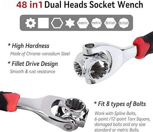 This socket wrench is made of 40CR-V that is high hardness, good toughness and durable.The finish is clean bright high-polished rustproof chrome plating with numeric etchings to show the corresponding sizes.The unique revolutionary tooth design allows you to do both standard and metric sizes simply flip the tool around and you have more sizes! No more lugging around heavy tool boxes.Unlike other wrenches, this 48 in 1 universal wrench lets you work at a 45° angles to fit nuts and bolts in different directions. 360 degree quick rotating heads.