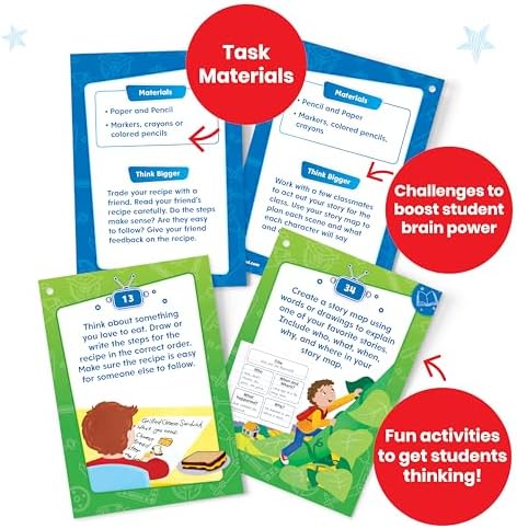 - STEM BINS FOR CLASSROOM: Each card has an open-ended task prompt based on a real-world situation, a list of needed materials, illustrations, and a Think Bigger challenge to encourage deeper learning and exploration.