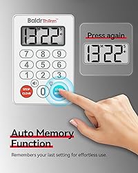 - BaldrTherm Visual Timer The BaldrTherm visual timer is designed to be user-friendly, featuring a straightforward 0-9 keypad that allows you to input your desired time with ease. A single button press is all it takes to clear the timer, making it both fun and easy to use for all ages. With a wide timing range from 00:00 to 99:99, this digital timer is perfect for a variety of tasks, including cooking, baking, skincare, yoga, reading, games, kids’ homework, and meetings. Equipped with a larger magnetic backplate, the timer securely attaches to various surfaces such as refrigerators, providing stability and easy access wherever you need it. The timer also features an auto memory function, remembering your last setting for effortless use. It offers 3 adjustable volume settings (loud 90dB, soft 80dB, and mute) and an indicator light, making it versatile for any environment, from quiet offices to noisy kitchens. The waterproof construction, rated IP67, ensures that the timer resists water and prevents dirt buildup, making it ideal for use in the kitchen, bathroom, or any other wet environment. Not just for the kitchen, this timer can be used as a bathroom shower timer, desk timer for study or work, and even as a productivity tool. It makes a great gift for any occasion, including Christmas, birthdays, New Year, back-to-school, and Father’s Day, and is a thoughtful and practical present for any loved one.