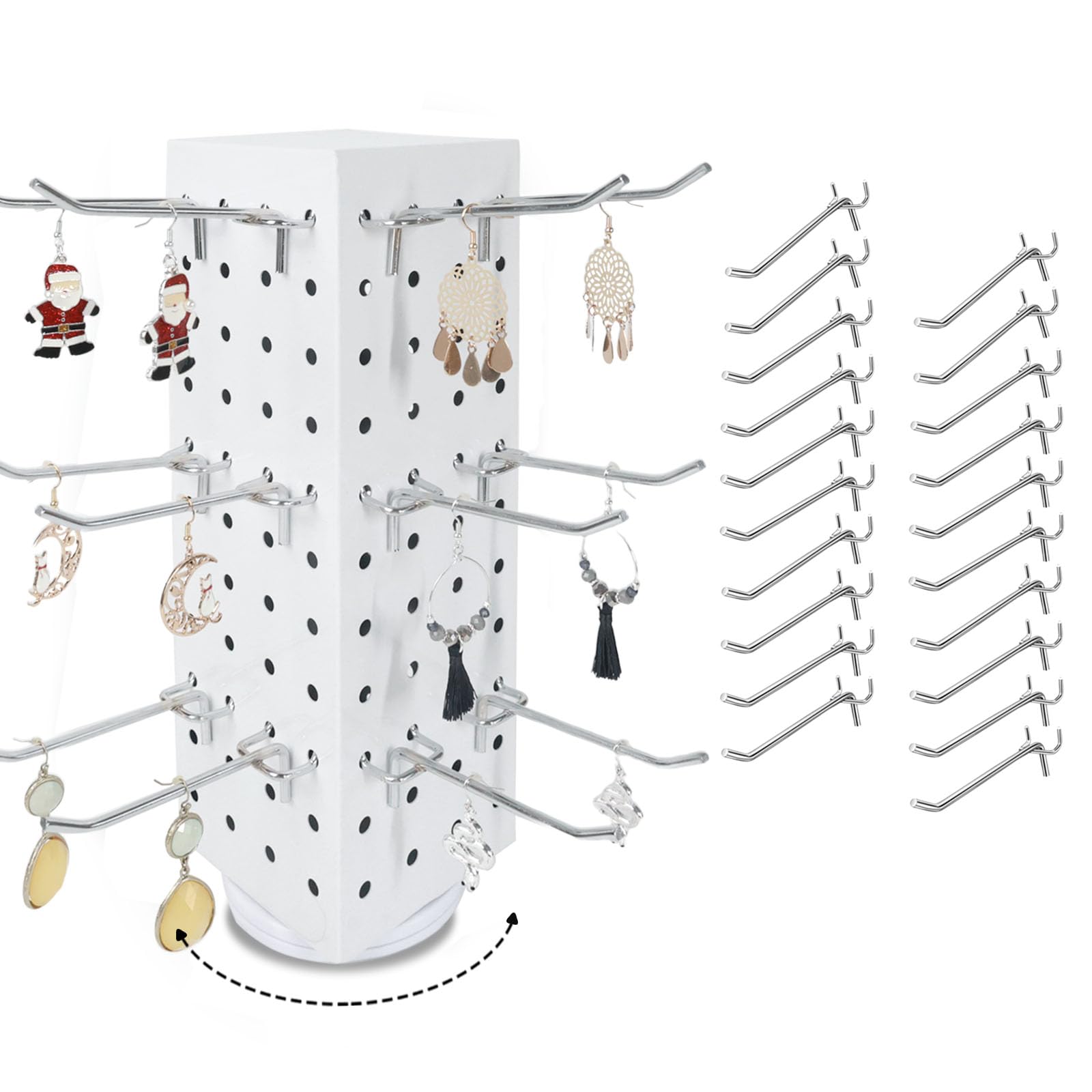 Rotating Pegboard with 20 Peg Hooks 4-Sided Pegboard Spinning Display Stand 4 x 4 x 12 Inches, Keychain Display Stand for Retail Display, Earring Display (White)