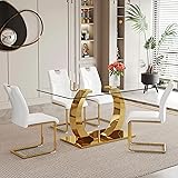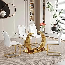 Modern Dining Table Set for 4:This dining table set for 4 with chairs is designed with both comfort and style, creating an feeling of lightness in dining area. Unique shape gold base of the dining room table set, suitable for a variety of decorate. Rectangle Dining Table Set:The dining table and chairs set of 4 is crafted from high-quality material, offering a contemporary aesthetic. The sleek metal base provides a stable foundation. Max load of the table up to 300 lbs. Comfy Dining Chair:Seating on the armless PU chair wrapped with high elastic sponge can relax your neck and legs. The surface is easy to maintain. The metal base is equipped with non-slip mats, avoiding scratched floor during movement. Maximum load capacity 300 lbs Low Maintain and Easy Assemble:Good quality material support low maintain. A simple wipe with a cloth is all the glass dining table set for 4 takes to retain the clean and lustrous finish. Thoughtful Customer Service:Self assembly is required, but don't worry, the installation instruction and tools will be delivered to your address together with the dinette table set for 4. Also the installation video is provided if you need.