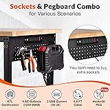- This workbench is made of solid rubber wood and thick steel plates, strong and durable. With high load bearing capacity, you can rest assured that you will be able to do your woodworking work on it. The foot cups have rubber pads to protect the floor while making it more stable. Equipped with under table shelf , socket, pegboard and complimentary hooks, it makes you work and store your tools more hassle-free.