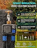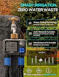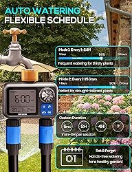 Customizable Dual-Zone Watering: Effortlessly control two zones with the Programmable Water Timer. Set watering intervals from every 1-24 hours for thirsty plants or every 1-15 days for drought-tolerant ones. Ideal for garden watering, lawn irrigation, or greenhouses, the customizable watering durations (from 1 minute to 360 minutes) ensure the perfect Automatic Water Timer for any outdoor space. Set and forget for stress-free, hands-free watering. Heavy-Duty Brass Build & Leak-Proof Design: Crafted with premium pure brass inlets that are completely lead-free and BPA-free, and housed in high-strength UV-resistant ABS resin, this outdoor water timer ensures durability and 100% leak-proof performance. The 360° leak-proof sealing prevents hose and faucet leaks, while the IPX5 waterproof and UV-resistant materials withstand all weather conditions. Supports up to 150 PSI and a flow rate of 30L/min, making it the ideal water timer for garden hose and high-pressure systems. Flexible Manual Watering Modes: Switch between Zone 1, Zone 2, or both using intuitive controls. This Dual-Zone Sprinkler Timer offers manual watering durations from 1 minute to 6 hours, ideal for deep soaking, car washing, or outdoor chores. Perfect for residential lawns, balconies, or patios, it provides flexibility without interrupting preset schedules. Smart Rain Delay & Water-Saving Features:Conserve water with the built-in Rain Delay feature, allowing users to skip watering for 24, 48 hours, or up to 7 days during rainy days. Advanced water-saving technology prevents overwatering, protects plants, and reduces water bills. The Auto-Resume Function ensures your Irrigation Timer picks up right where it left off, keeping your lawn irrigation running smoothly. Low Battery Alert & Auto Shutoff:Stay in control with the 2.5" LCD display, showing schedules, next watering cycle, and battery status. A Low-Battery Indicator alerts you when it’s time to replace batteries, and the Auto Valve Shutoff prevents overflow during power loss. This Battery-Powered Water Timer with memory retention ensures reliable performance even when the power runs out. Effortless Installation & Easy Operation: Set up this Hose Faucet Timer in under 5 minutes using the intuitive dial and buttons—no tools required. The 360° rotatable interface makes connection to your faucet simple. The large LED display and straightforward controls offer hassle-free programming, making it user-friendly for any yard or garden. Includes a quick-connect hose adapter for easy connection to your garden hose. Weather-Resistant & Built to Last:Designed for long-term outdoor use, the IPX5 waterproof build withstands rain and outdoor conditions, while the UV-resistant coating prevents sun damage. The rust-resistant materials ensure this Weatherproof Water Timer endures through all seasons, making it a reliable choice for any garden watering system. Versatile Applications for Every Garden:Perfect for lawn irrigation, potted plant care, greenhouses, or commercial landscaping. Whether you're on vacation or managing everyday watering, this Smart Sprinkler Timer adapts to your needs, providing efficient watering for balconies, patios, and large residential lawns. Added Feature for Better User Experience: Watch our step-by-step installation & troubleshooting video directly on the listing. If you encounter any issues, contact us immediately — we're here to help! Added Feature for Better User Experience: Watch our step-by-step installation & troubleshooting video directly on the listing. If you encounter any issues, contact us immediately — we're here to help!