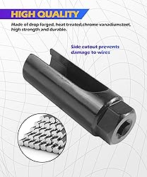 [High-Quality Materials]: This car sensor socket is made of high-quality 65 manganese steel, with a hard texture, high strength and excellent durability, not easy to deform or break. The black oxidized surface treatment effectively prevents rust and corrosion, can adapt to various working environments and weather conditions, and has a long service life. [Function]: The oxygen sensor is an important part of the fuel correction of the car engine, which always fine-tunes the air-fuel ratio to maintain the best air-fuel ratio in the engine cylinder. The purpose of this oxygen sensor socket is to install and remove the oxygen sensor, which is a tool for timely replacement when the oxygen sensor fails. [With Side Opening]: The standard 6-point groove design with side opening can protect the cable from damage and allow the oxygen sensor to be removed when the wiring is connected. The socket is compact and provides extra leverage even in hard-to-reach places. [Easy to Operate] The oxygen sensor socket is easy to operate and provides extra leverage even in hard-to-reach places. Even if you don't have rich experience in car repair, you can easily repair it. Please note that a wrench is required for tightening. [Widely Applicable]: The car sensor socket has a wide range of applications and can be used in various types of vehicles, such as cars, SUVs, trucks, etc. Universal 6-point 7/8 inch (22mm) socket, hexagonal shape, fits almost all oxygen sensors with 7/8" hex nuts, 3/8 inch square head at the top, can be used with ratchet wrench. Please check the specification size before purchasing.
