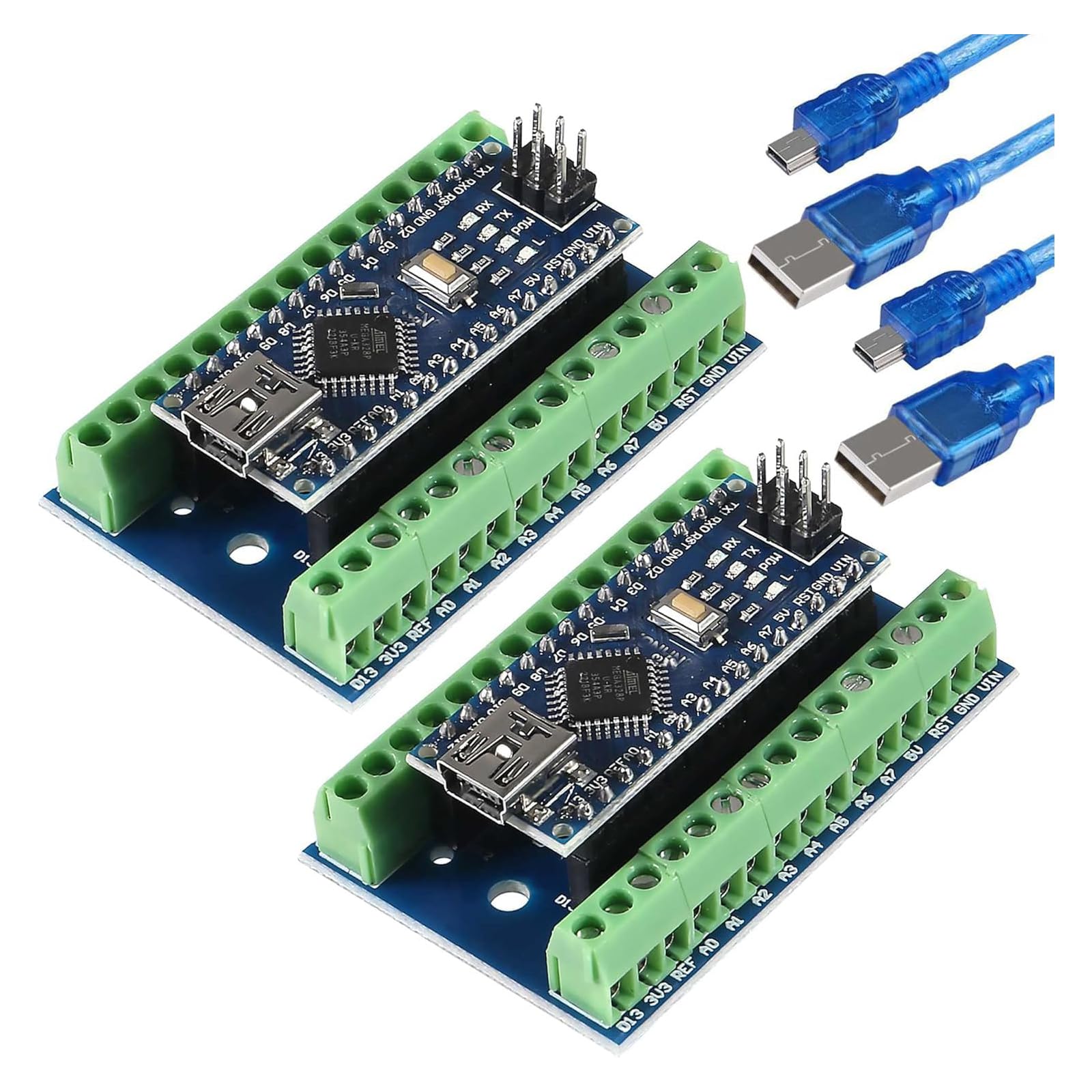 - Improved Version: Improved Arduino Nano V3.0 ATMEGA328P with 3 headers (2 15-pin headers+1 6-pin connector).The enhanced design offers more connection options.