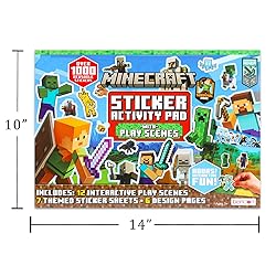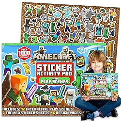 Minecraft Stickers Ultimate Activity Pad - Bundle with Over 1000 Minecraft Video Game Stickers, Sticker Scenes, Activity Pages, More for Kids Boys Girls. Large Minecraft sticker set includes 1 Minecraft sticker pad with 1000+ reusable stickers on 7 sheets, 12 interactive scenes, and 6 design pages. Includes over 1,000 Minecraft stickers and activity scenes featuring Alex, Steve, Enderman, Ender Dragon, Creepers, Chicken Jockey and more Minecraft heroes, villains and scenes. This Minecraft video game sticker activity pad is great to keep your little one entertained at home or on the road. Officially licensed Minecraft activities for boys and girls.